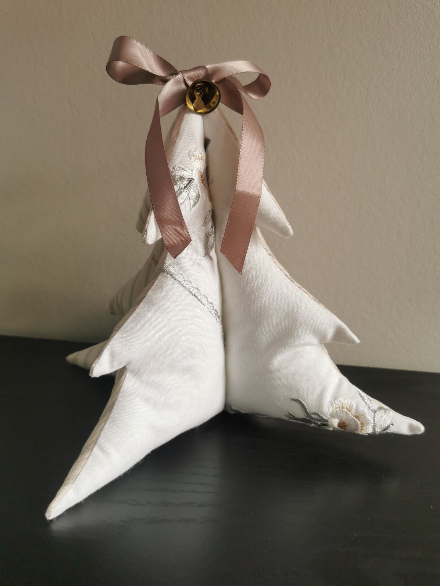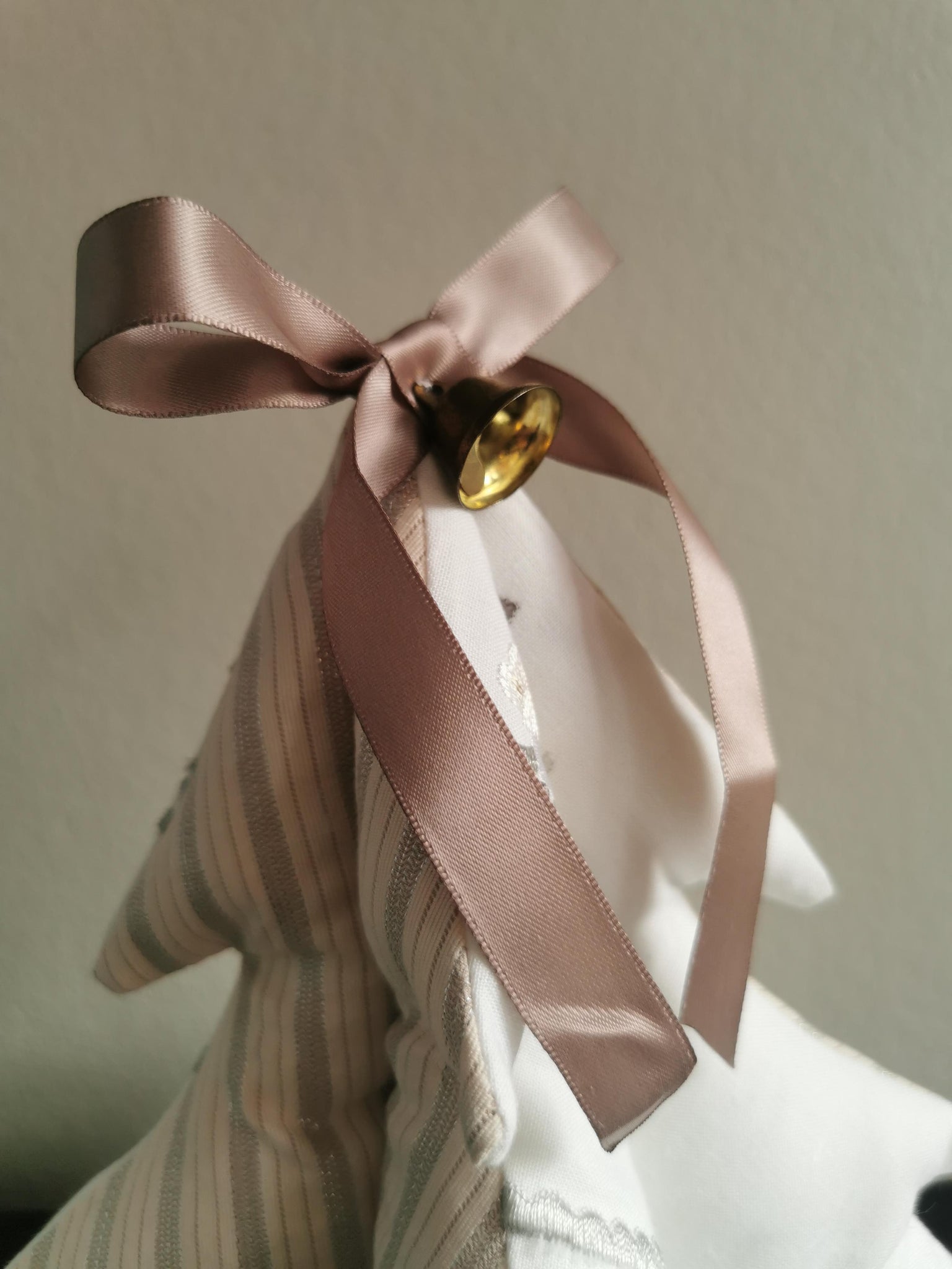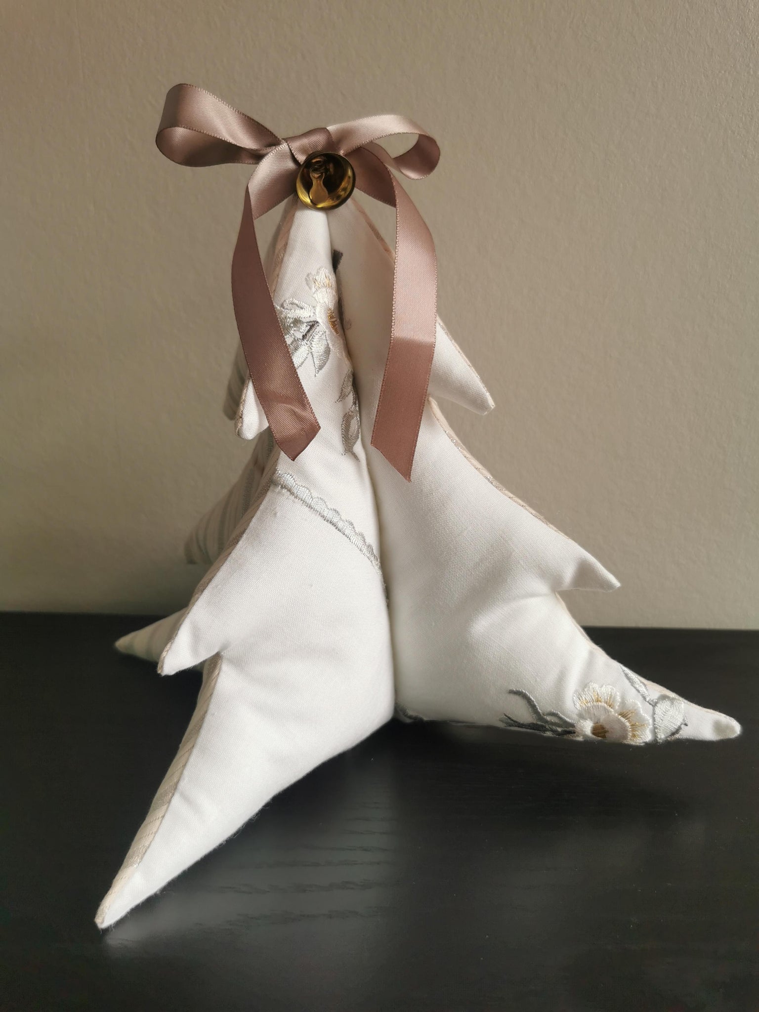 Juletræ på ca. 24 cm. syet af to forskellige slags vintagestof. Træet har en genbrugt messingklokke samt en fin sløjfe i toppen.