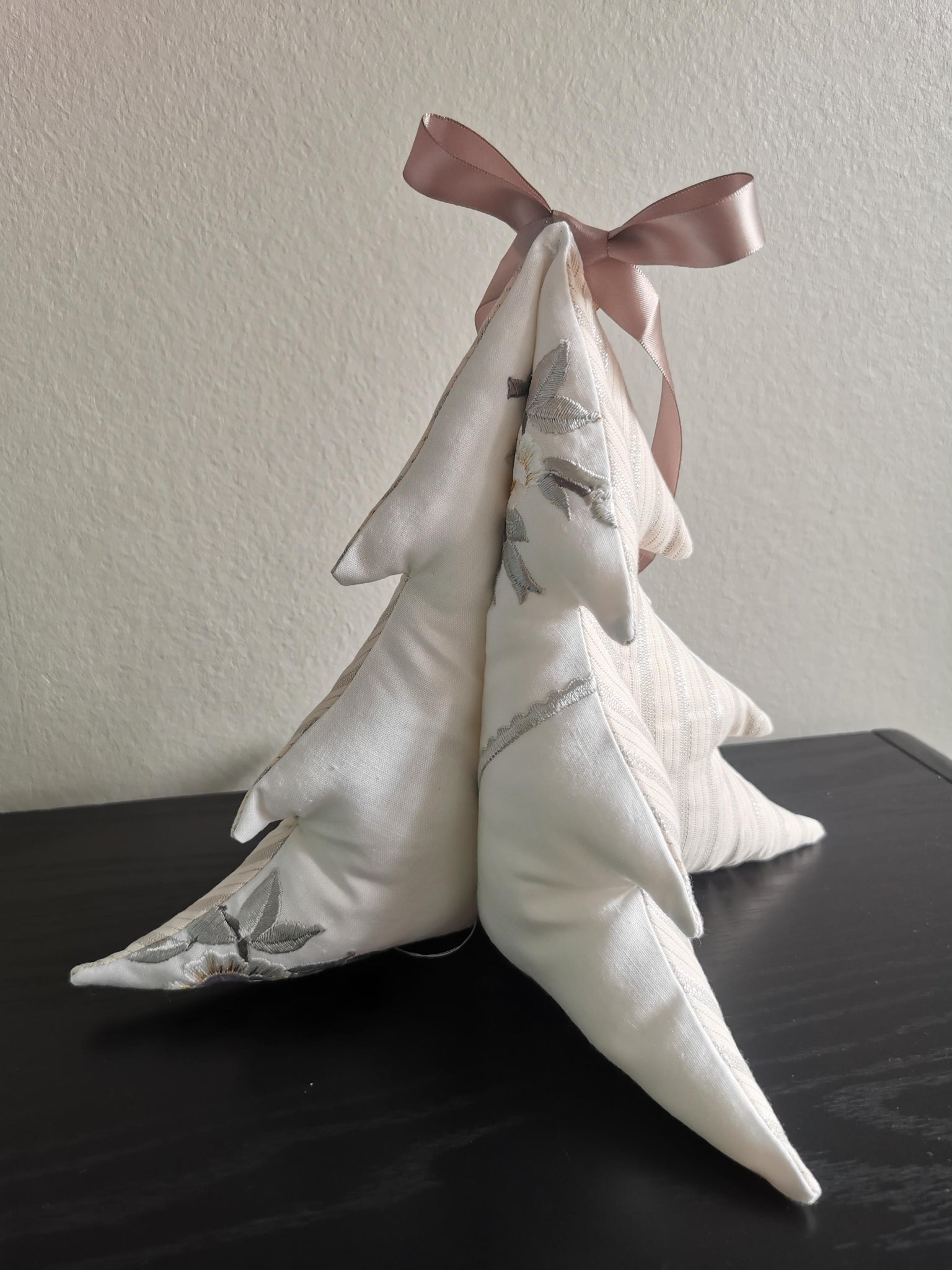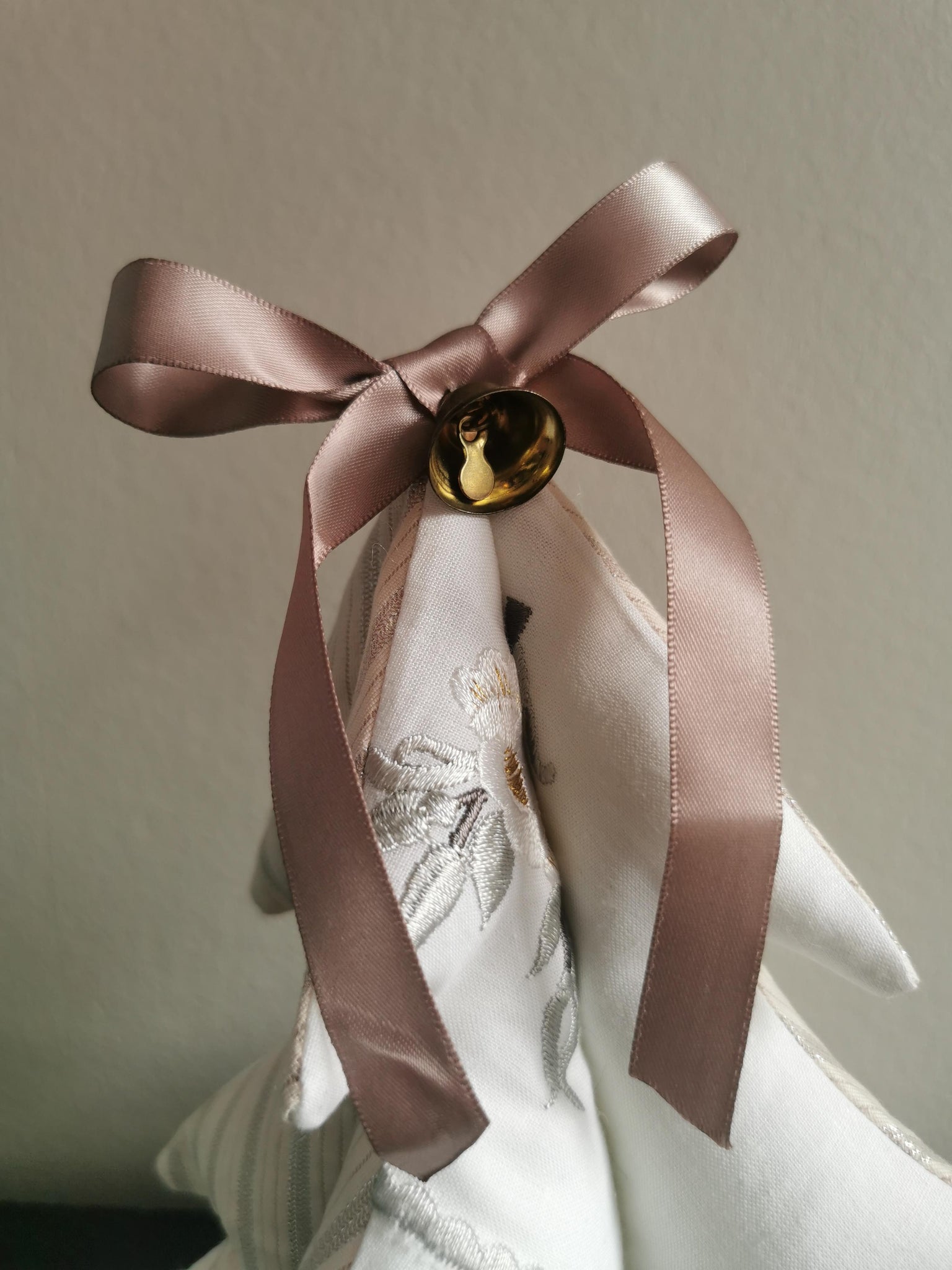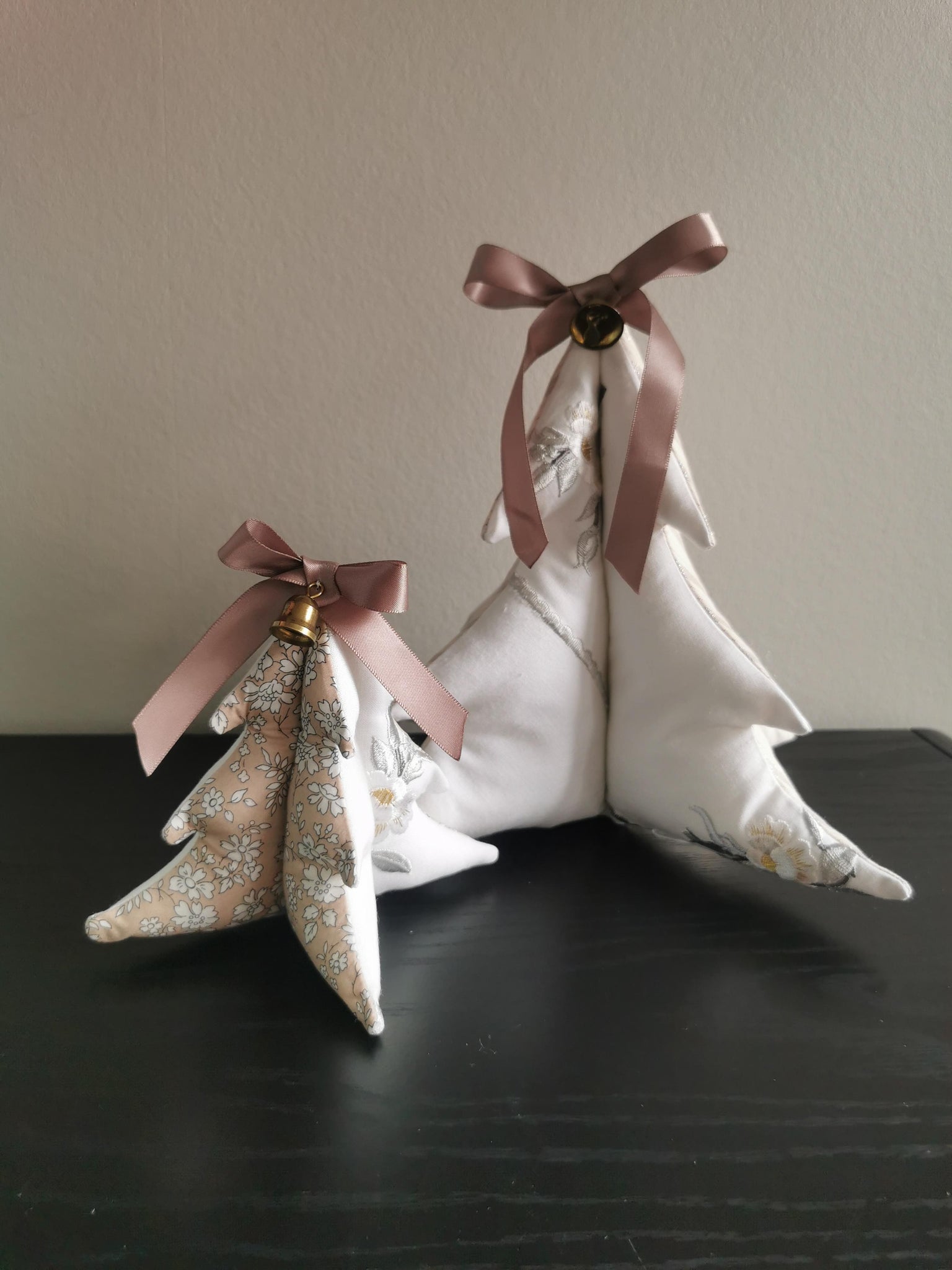 Juletræ på ca. 24 cm. syet af to forskellige slags vintagestof. Træet har en genbrugt messingklokke samt en fin sløjfe i toppen.