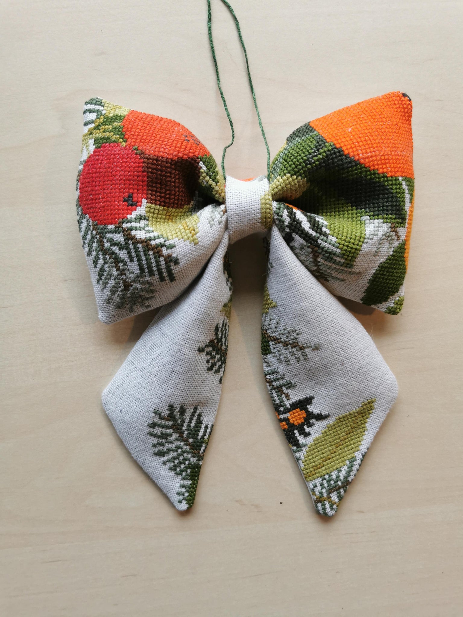 En fin sløjfe til ophæng syet af af detaljeret broderet vintagestof. Baggrundsfarven er hvid, med fine grønne og orange broderier på.