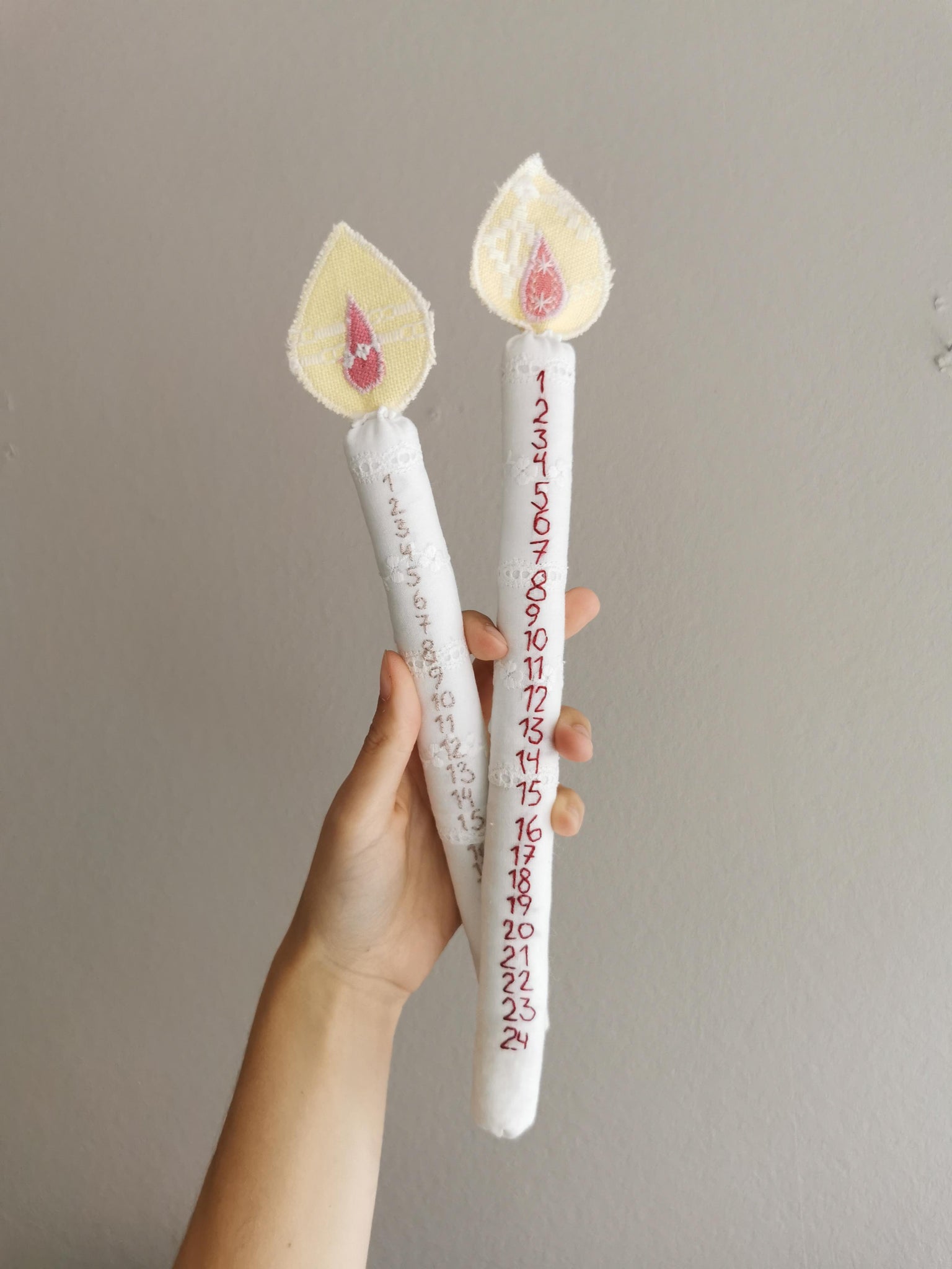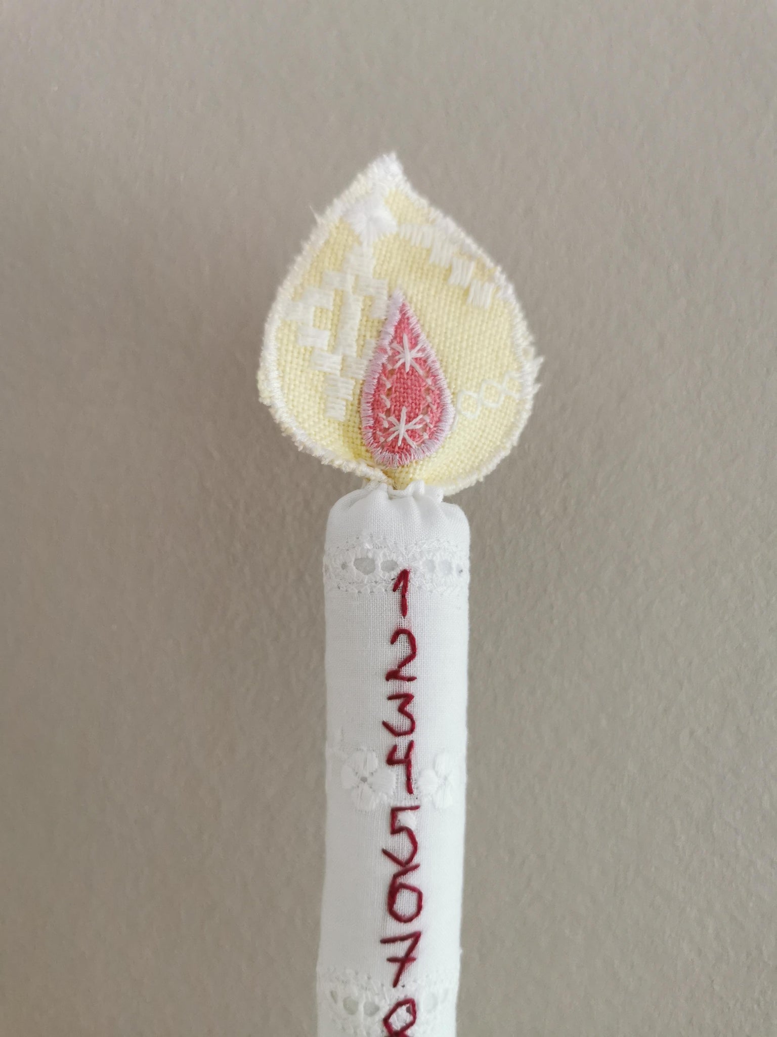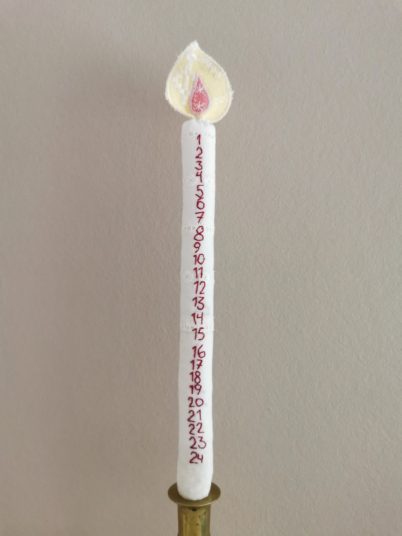 Evigheds-kalenderlys syet af vintagestof. Selve lyset er syet i hvid-på-hvid broderie anglaise stof med mørkerøde tal 1-24 broderet i hånden.