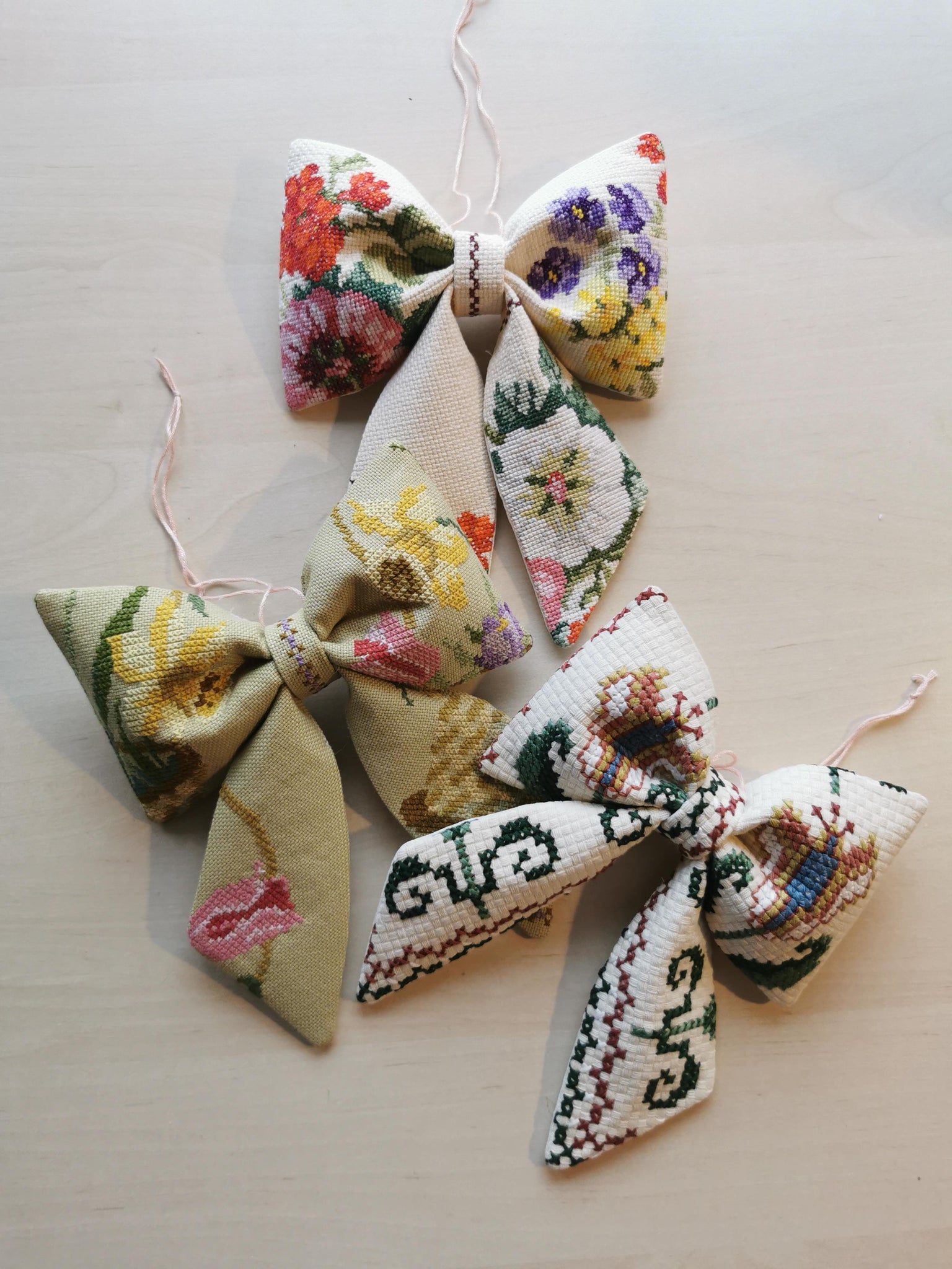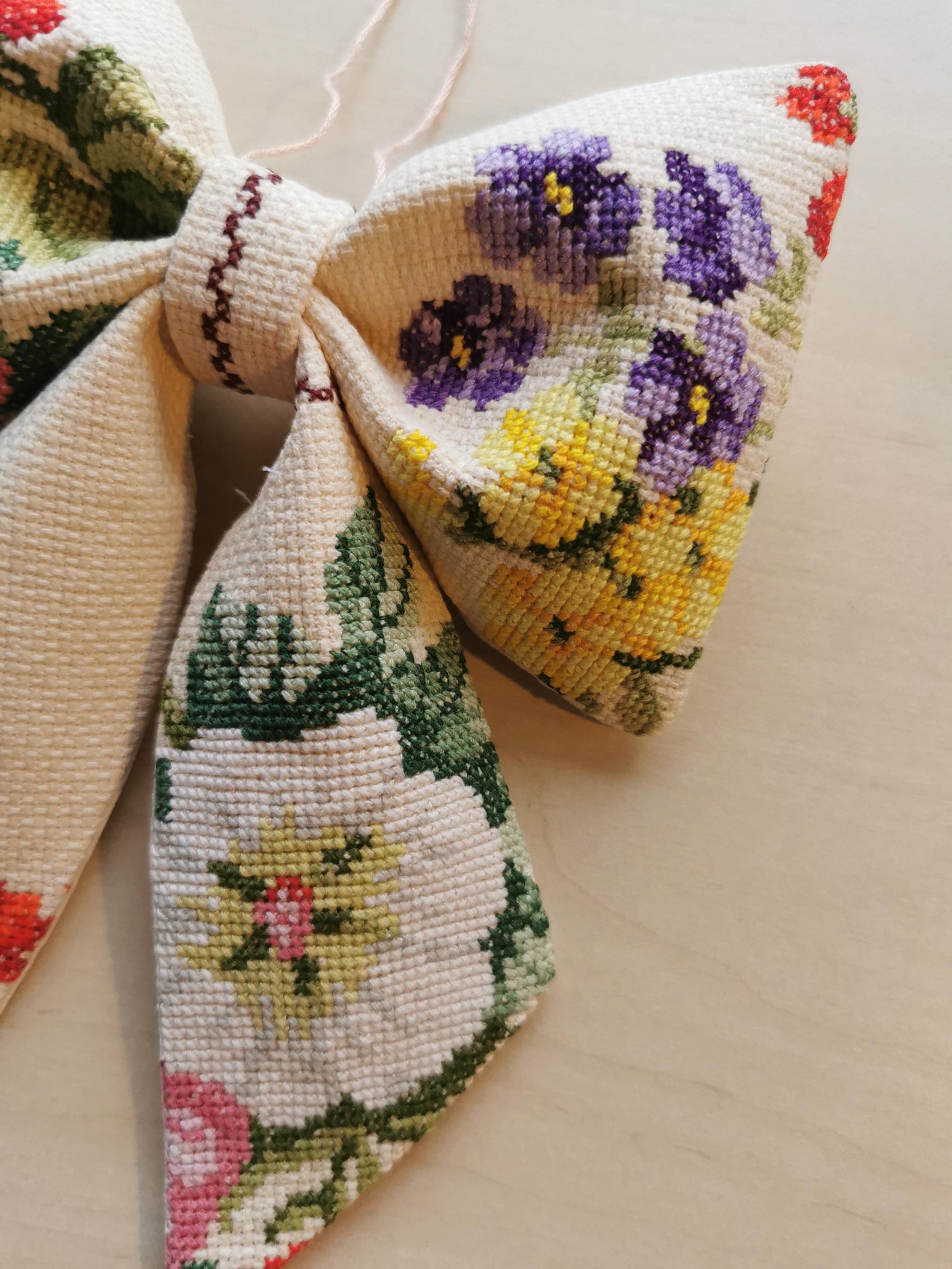 En fin sløjfe til ophæng syet af af detaljeret broderet vintagestof. Baggrundsfarven er råhvid, med smukke farverige blomster  broderet på.