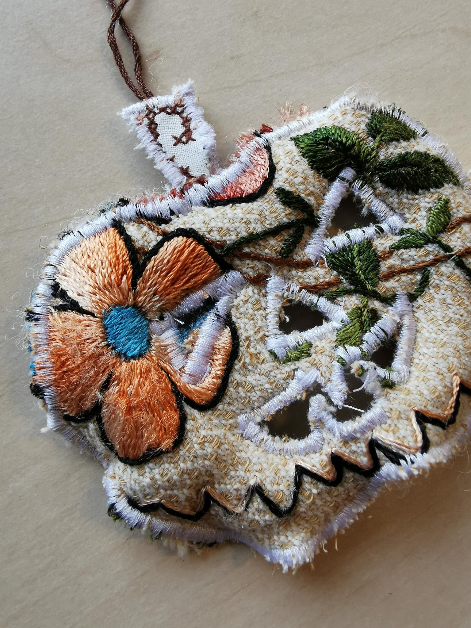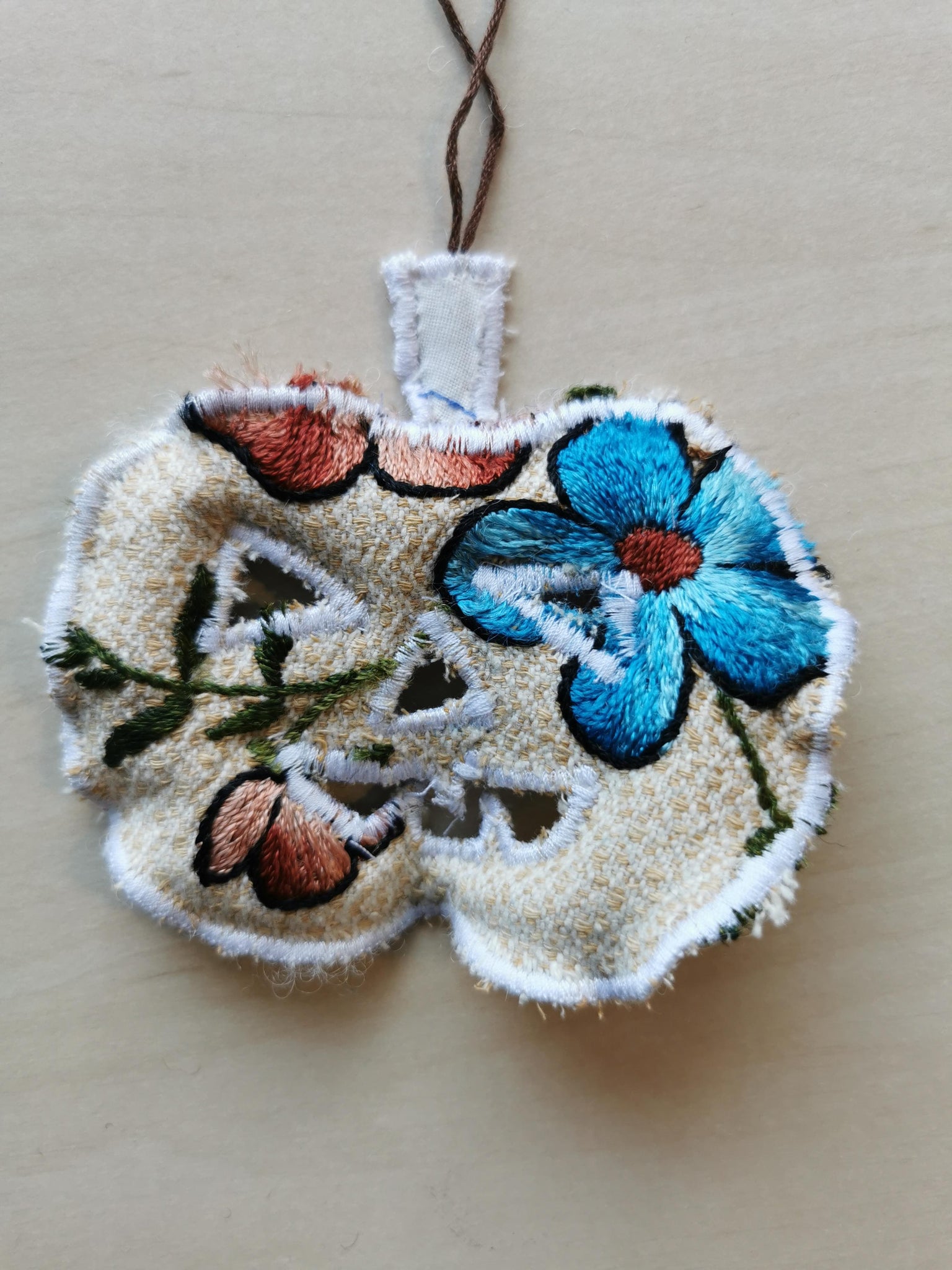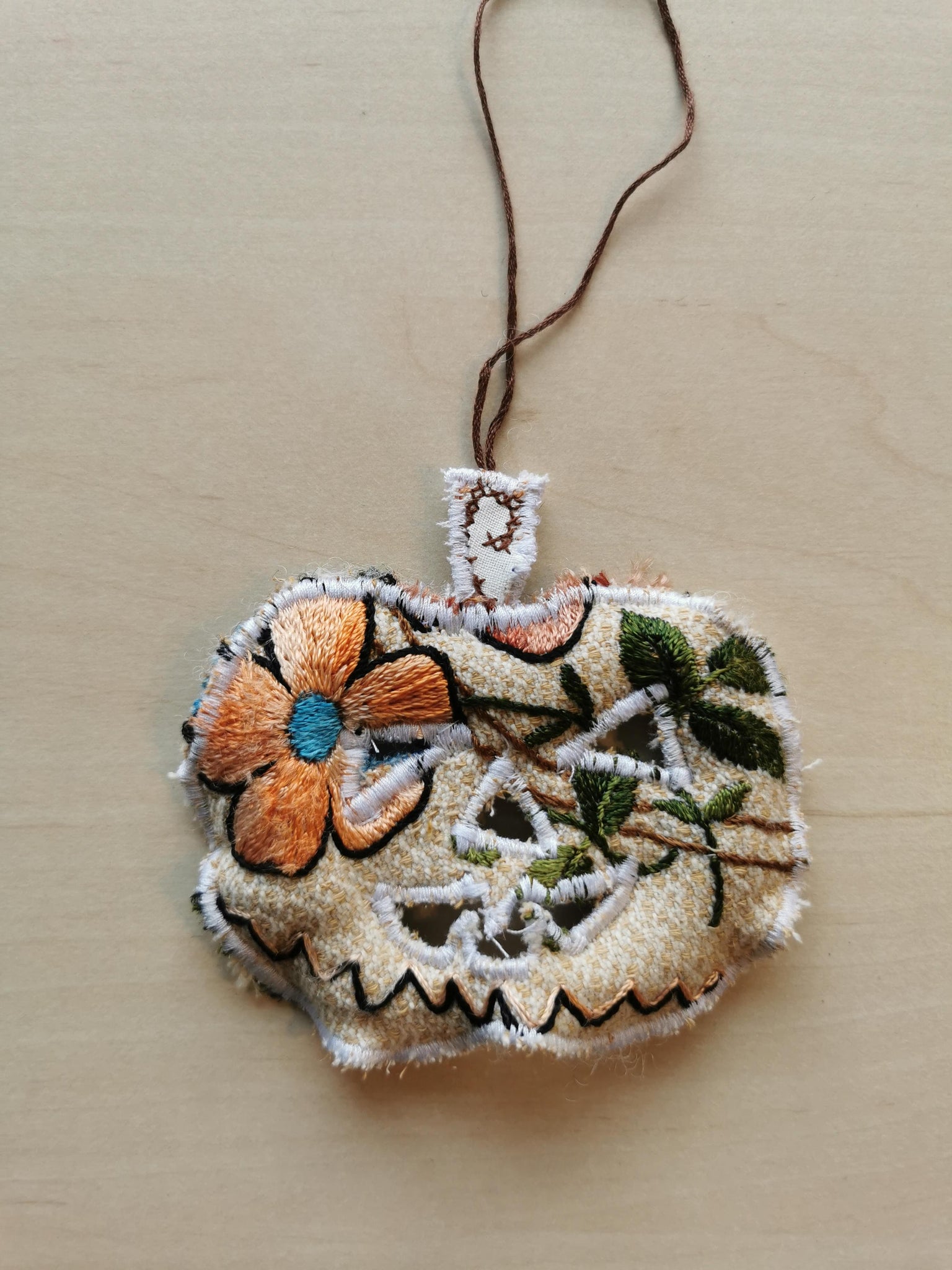 Lille halloween ophæng fint håndbroderet vintagestof med blomster.