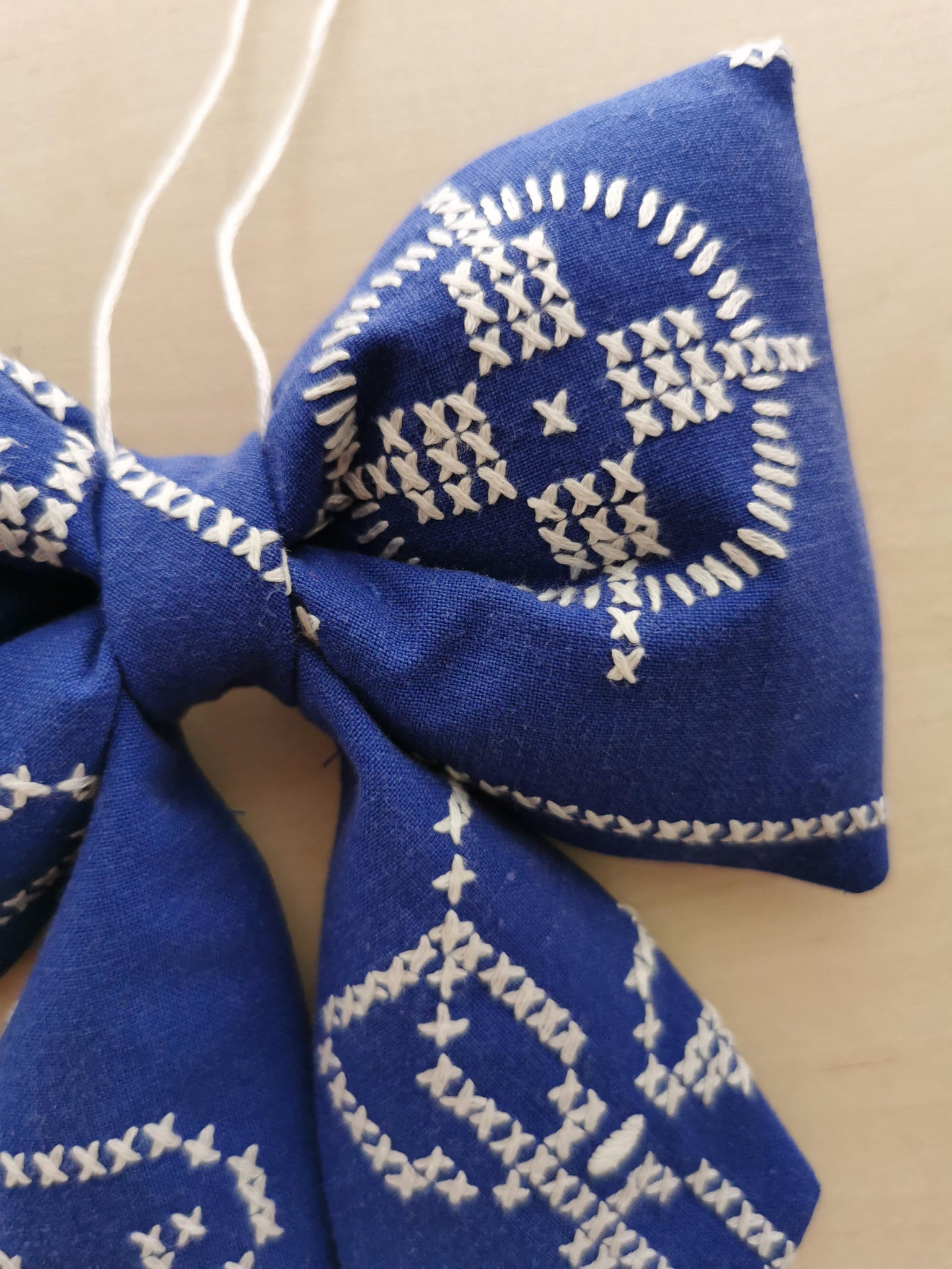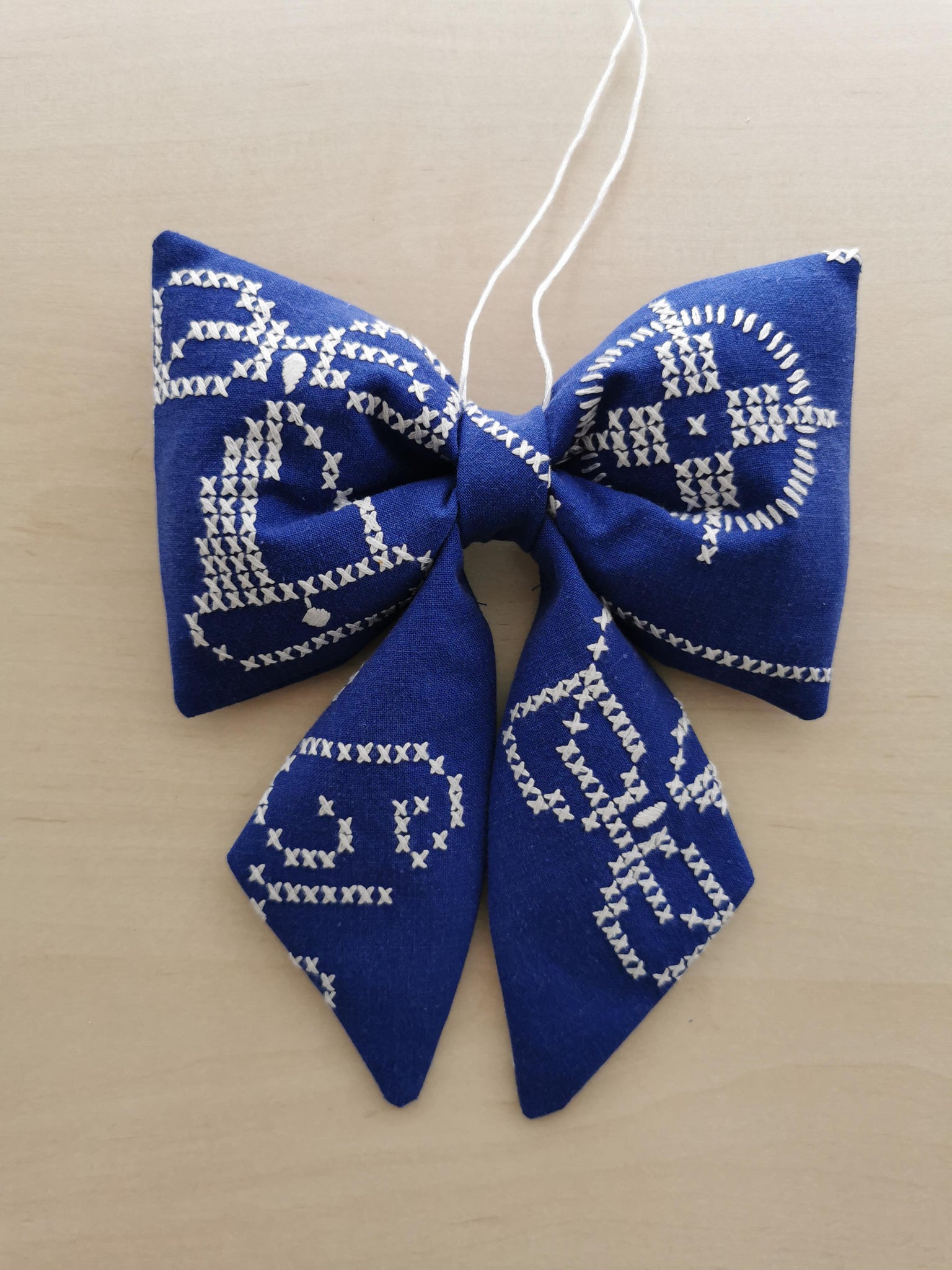 En fin sløjfe til ophæng syet af af detaljeret broderet vintagestof. Baggrundsfarven er en smuk mørkeblå, med hvide korsstingsbroderier.
