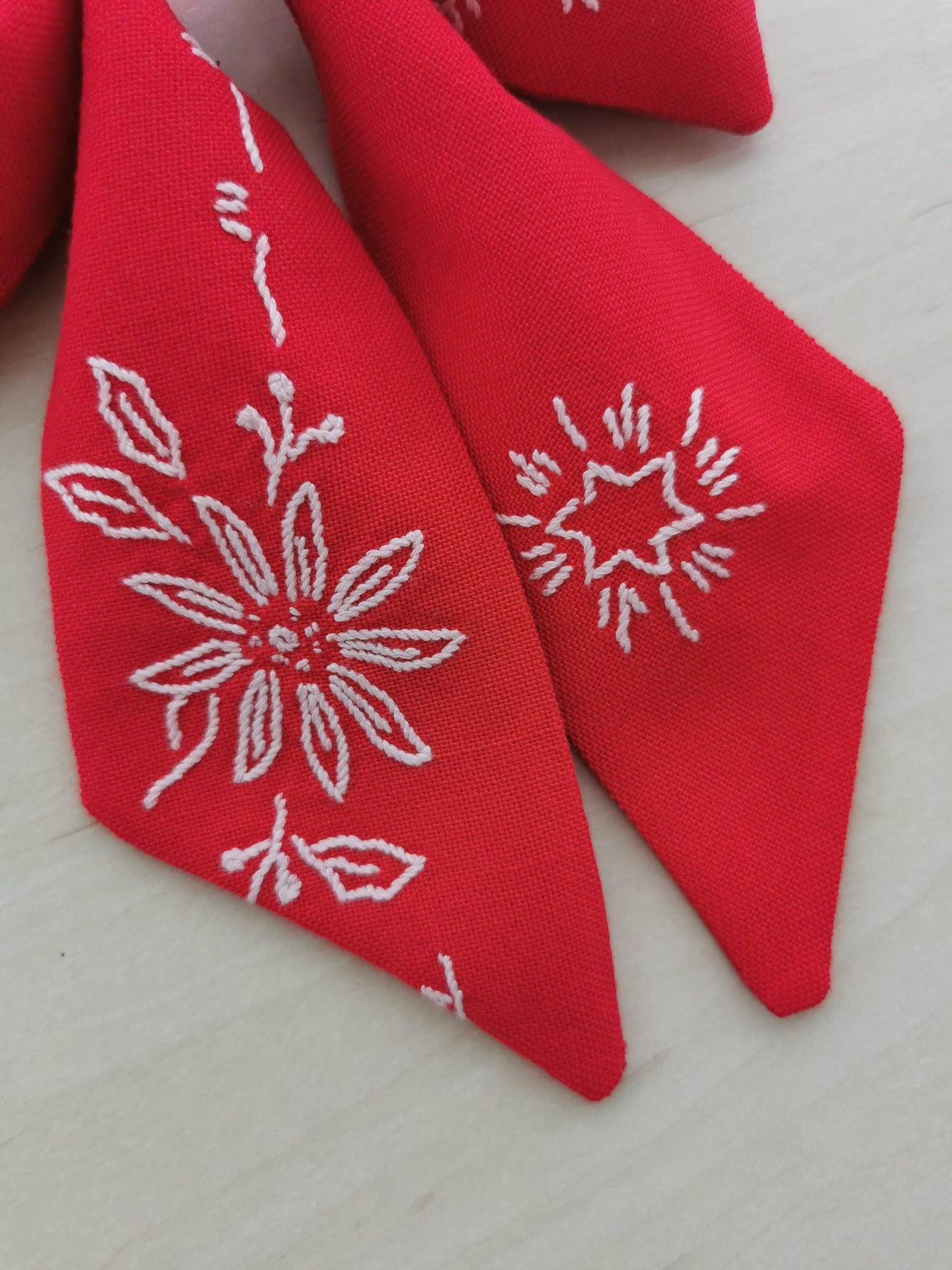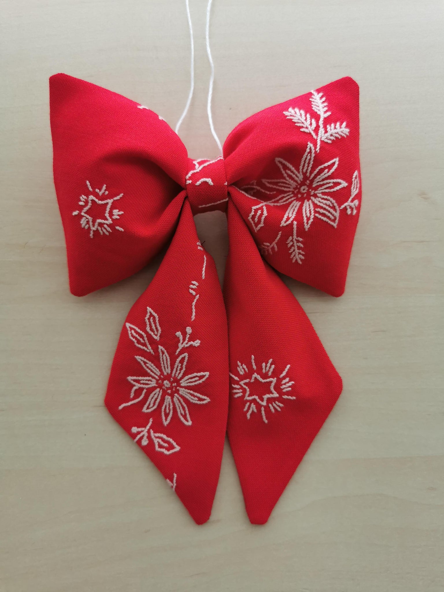 En fin sløjfe til ophæng syet af rødt vintagestof med smukke, håndbroderede hvide detaljer.