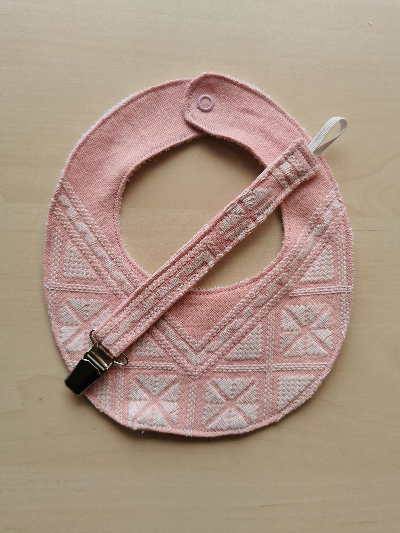 suttesnor syet af genbrugsstof i en fin klar lyserød farve med hvide håndbroderier.