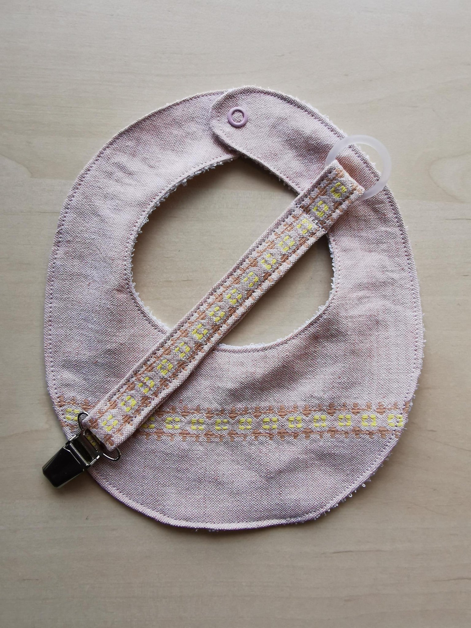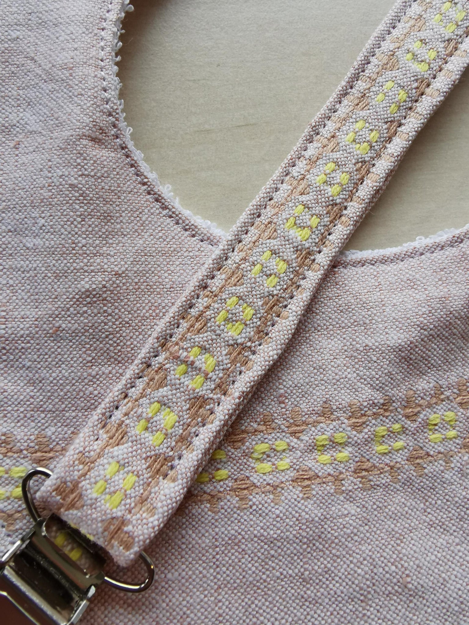 suttesnor syet af genbrugsstof i en fin støvet rosa farve med gule og lyserøde vævninger.