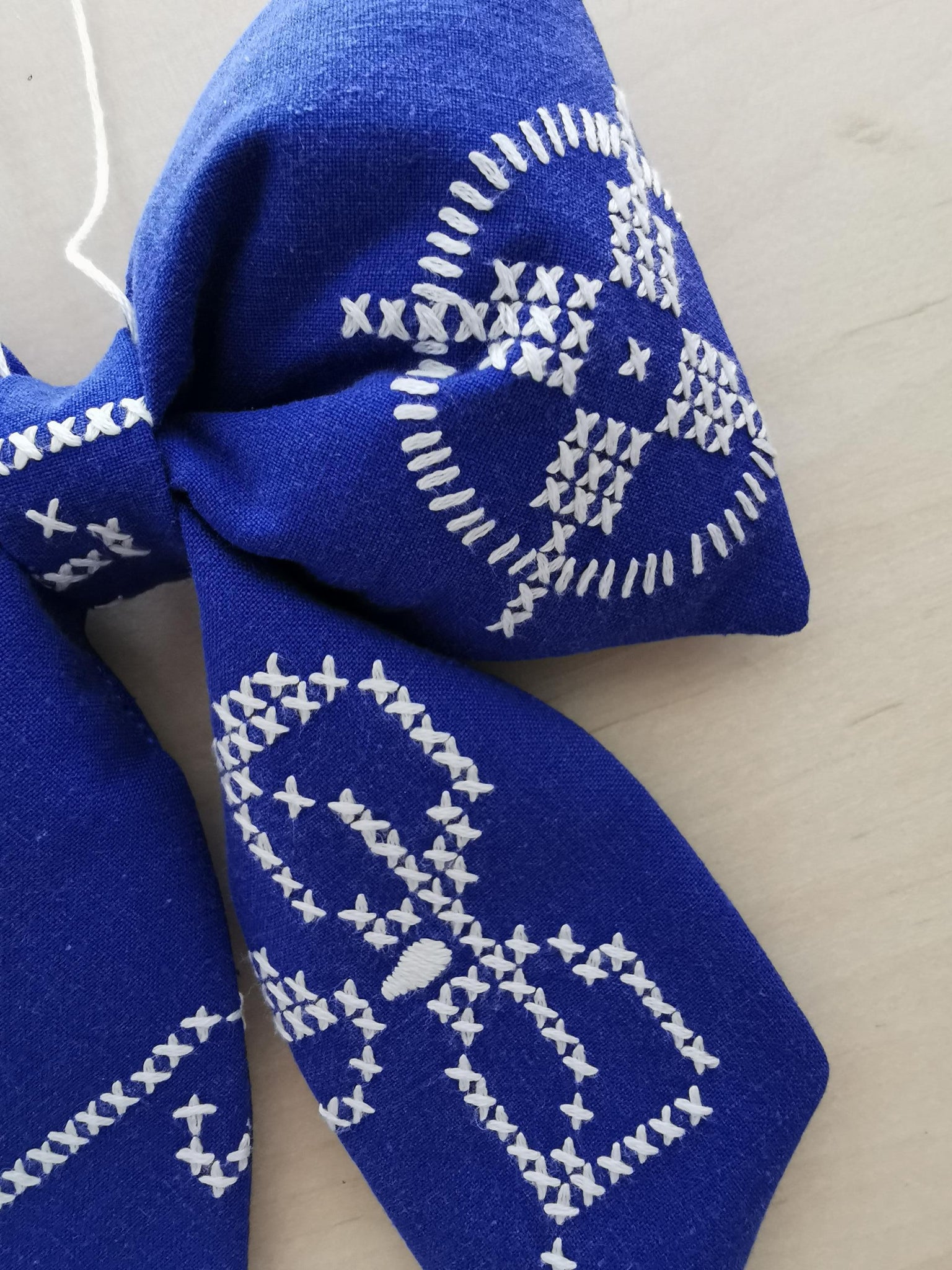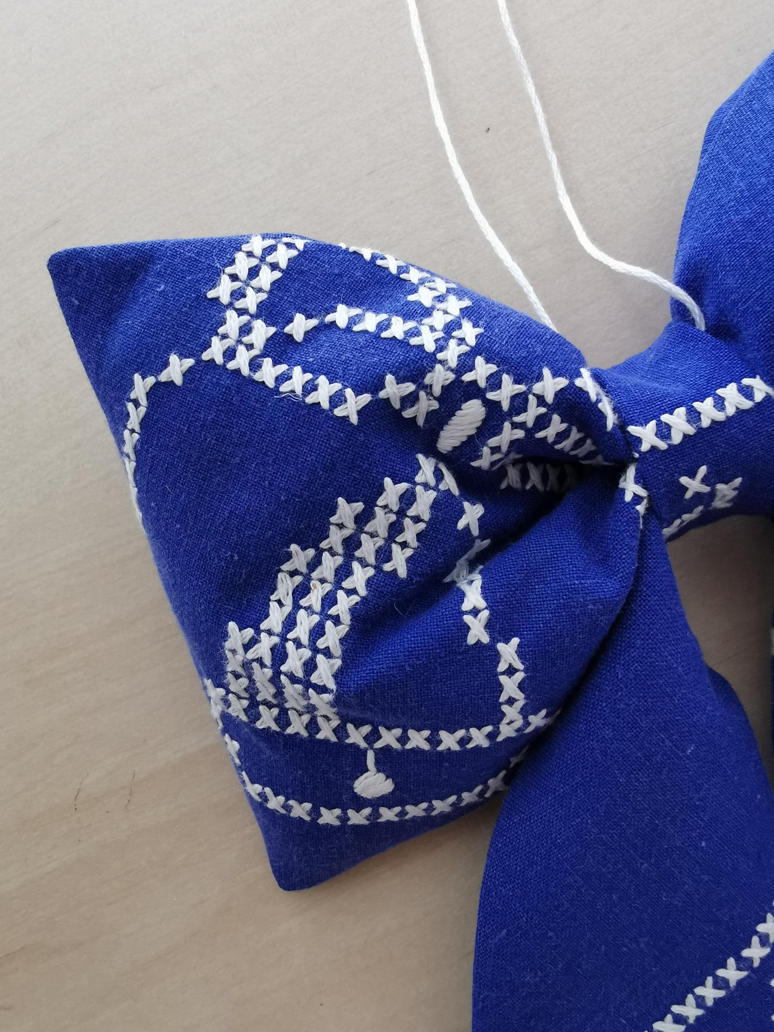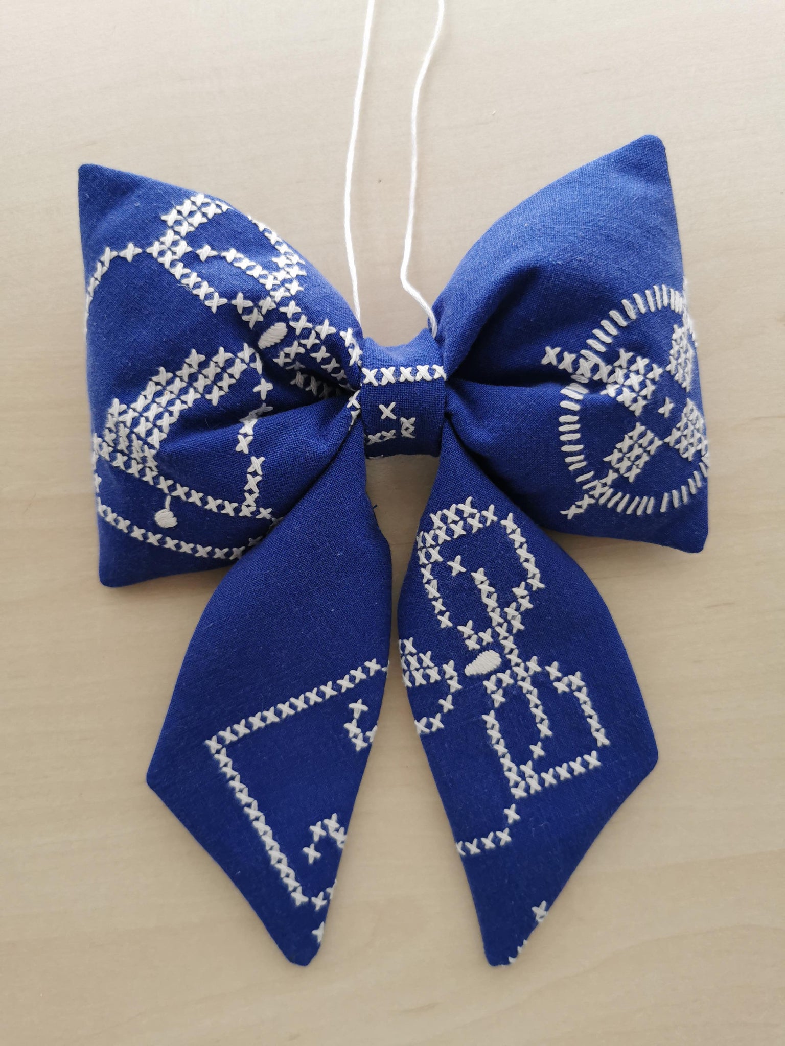 En fin sløjfe til ophæng syet af af detaljeret broderet vintagestof. Baggrundsfarven er en smuk mørkeblå, med hvide korsstingsbroderier.