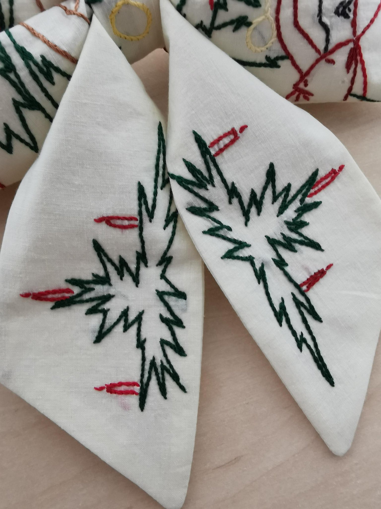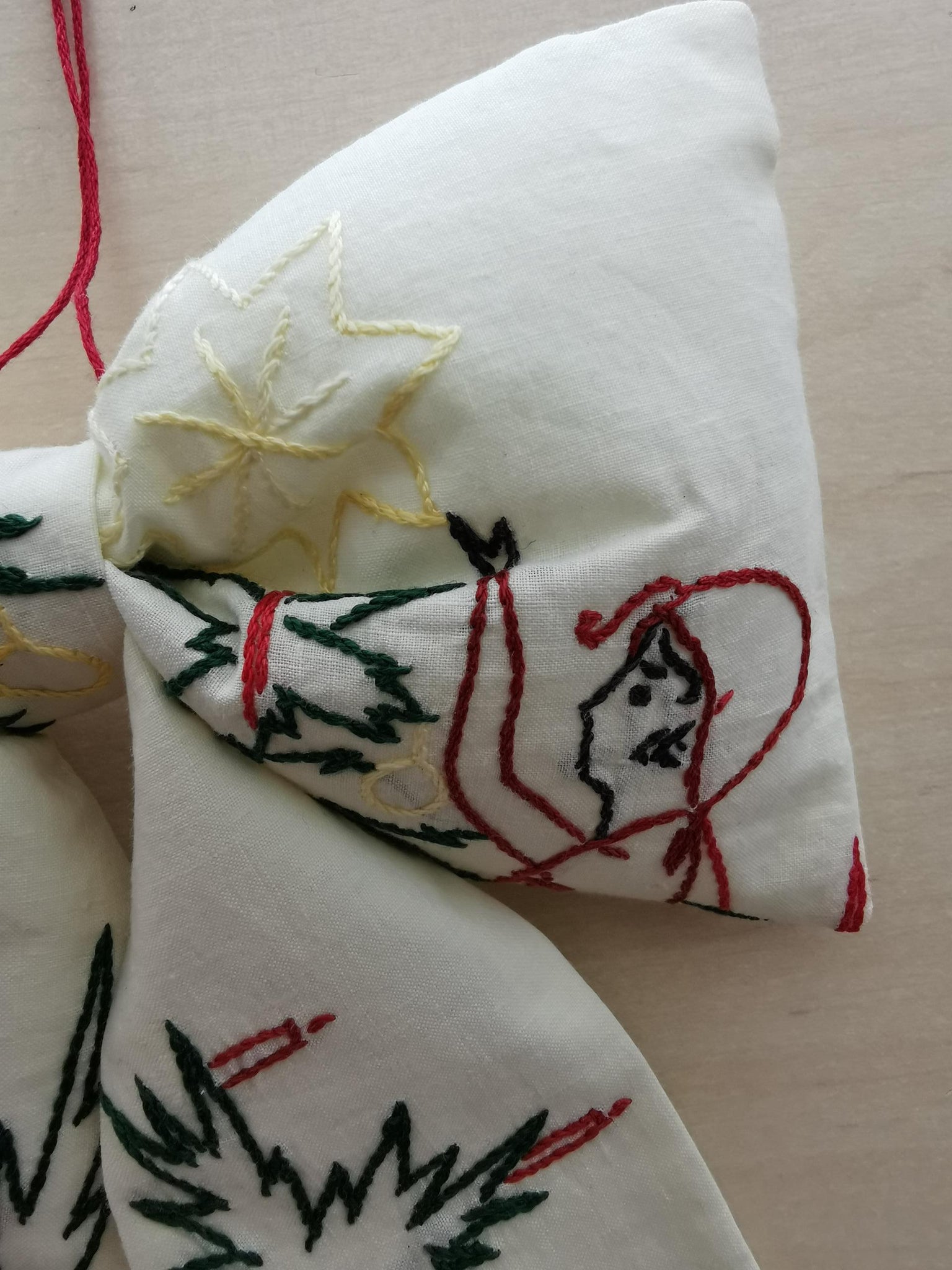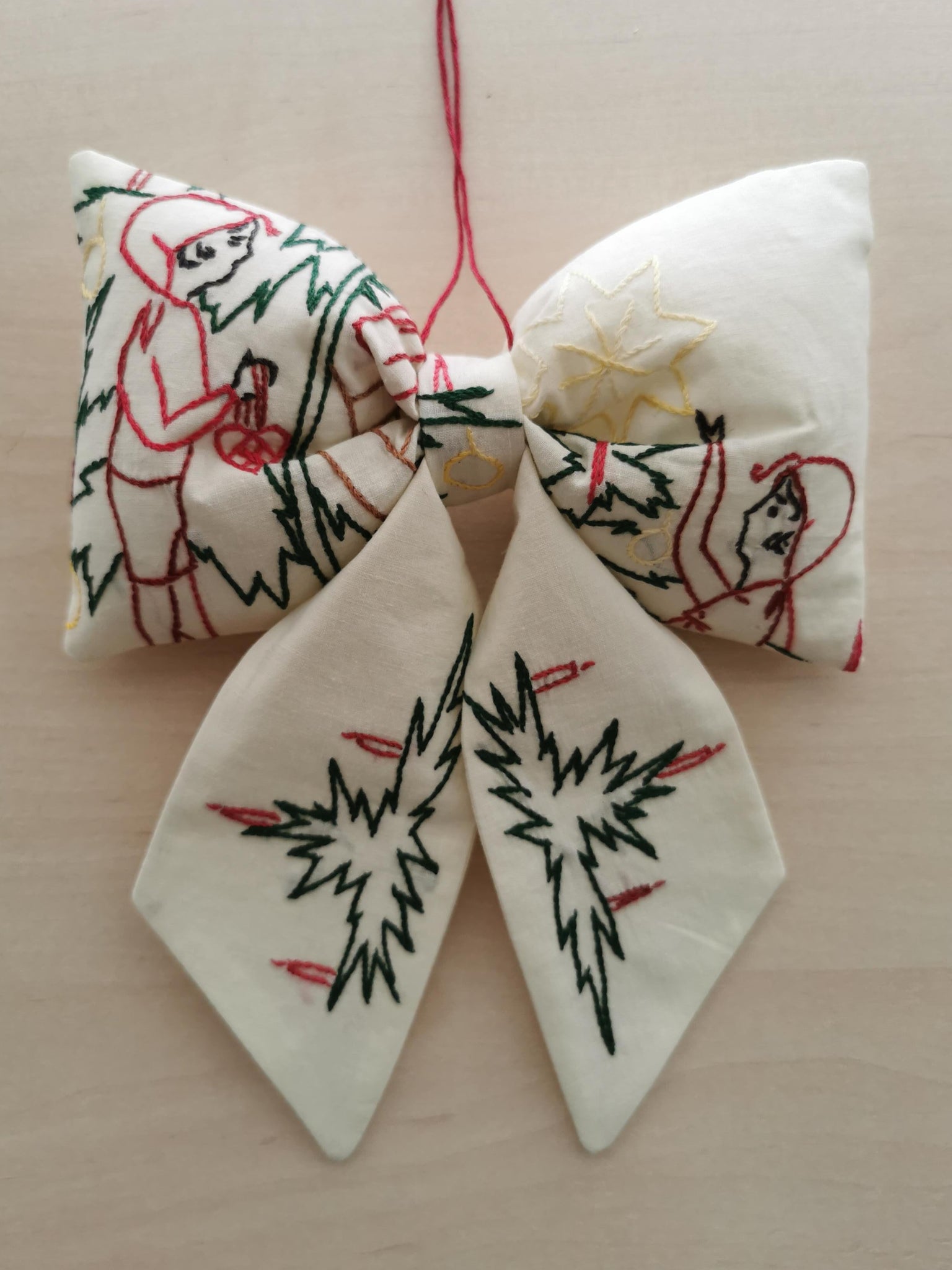 En fin sløjfe til ophæng syet af af detaljeret broderet vintagestof. Baggrundsfarven er råhvid med fine broderier af nisser der pynter juletræ. Den ene sætter stjernen på, den anden et flettet julehjerte.