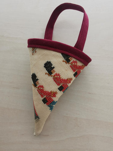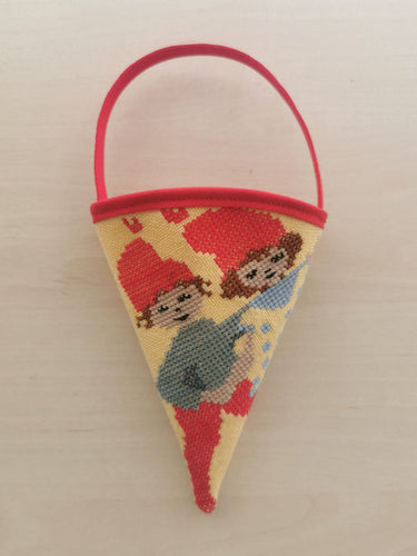 Sløjfe - råhvid med broderede nisser der pynter juletræ