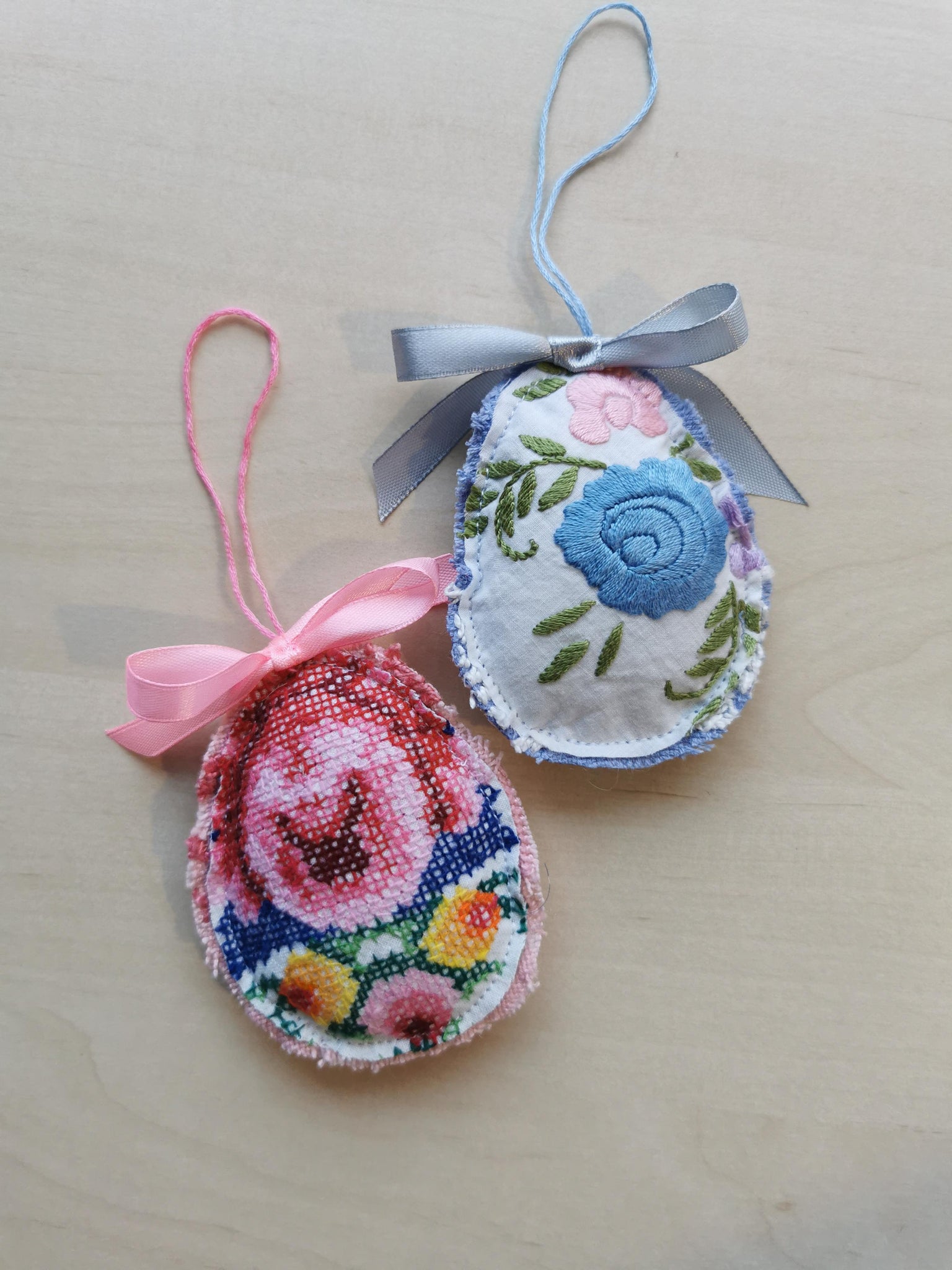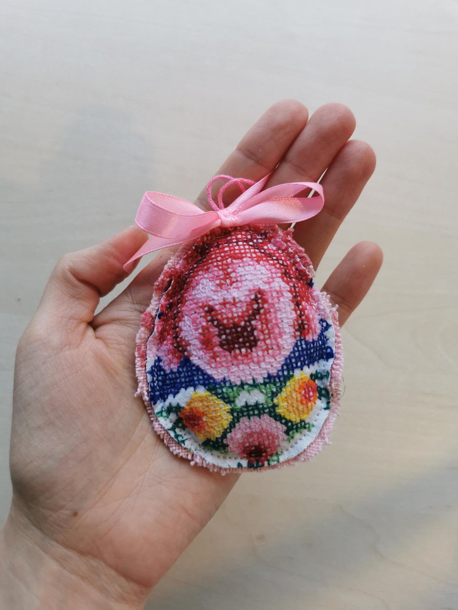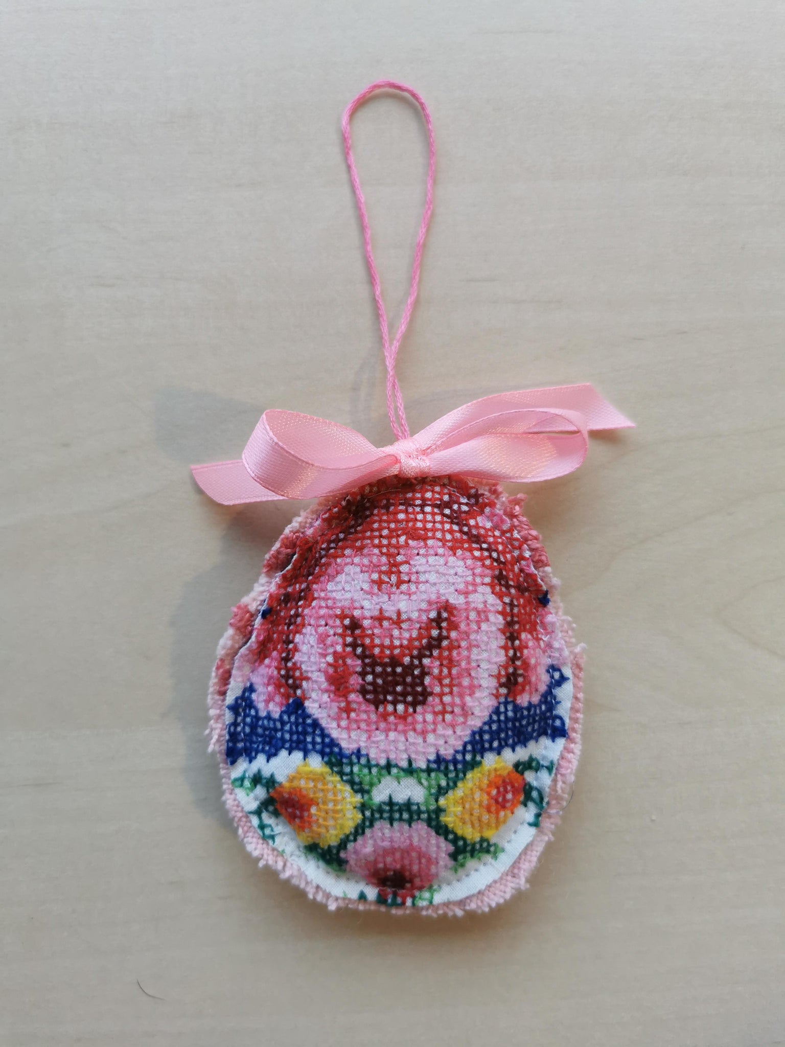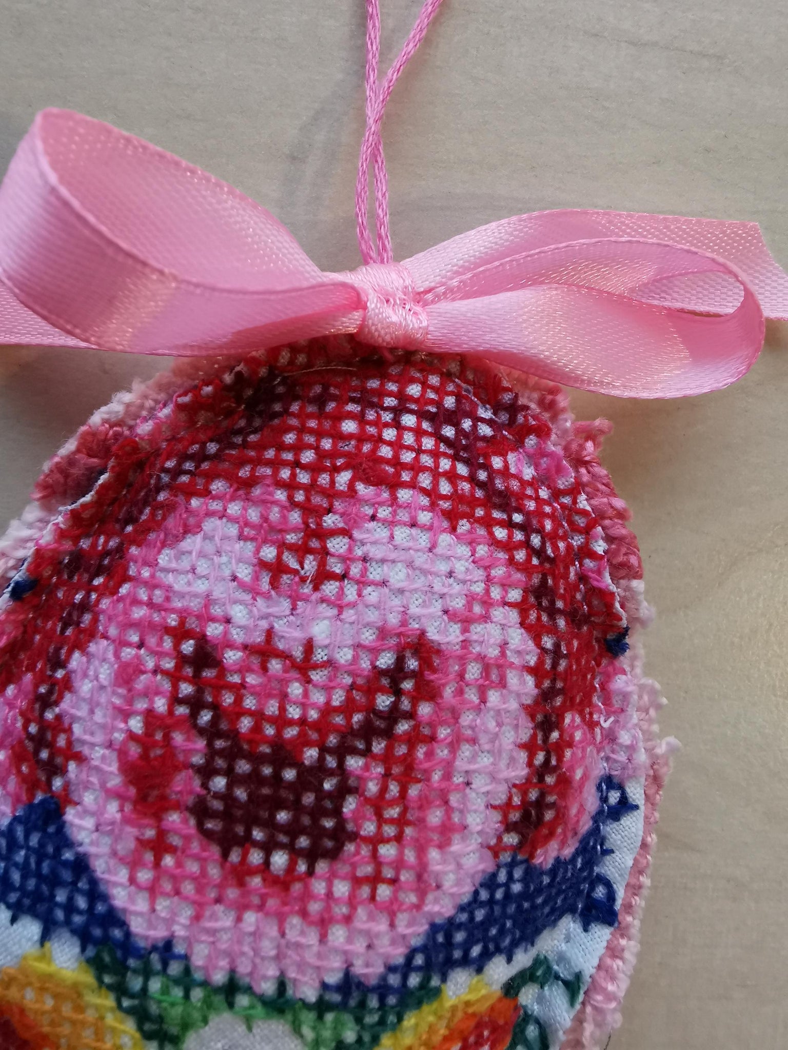 Påskeæg med fint og detaljeret håndbroderi i lyserøde farver. For- og bagside er syet i forskelligt stof. og på "forsiden" kan den lyserøde bagside ses som en fin kant hele vejen rundt langs ægget.