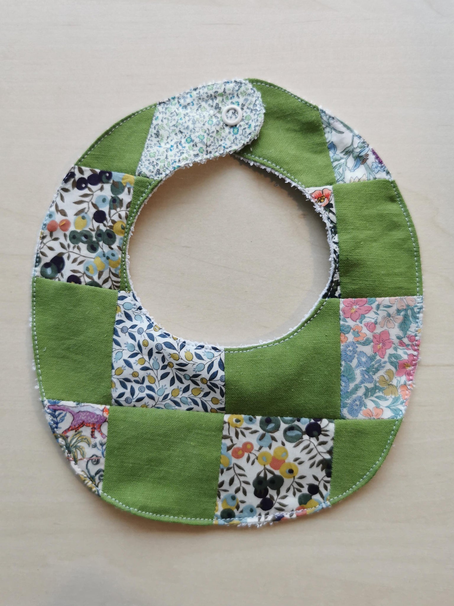 Savlesmæk syet i et patchwork af Liberty rester blandet med varmt græsgrønt ensfarvet bomuldsstof.