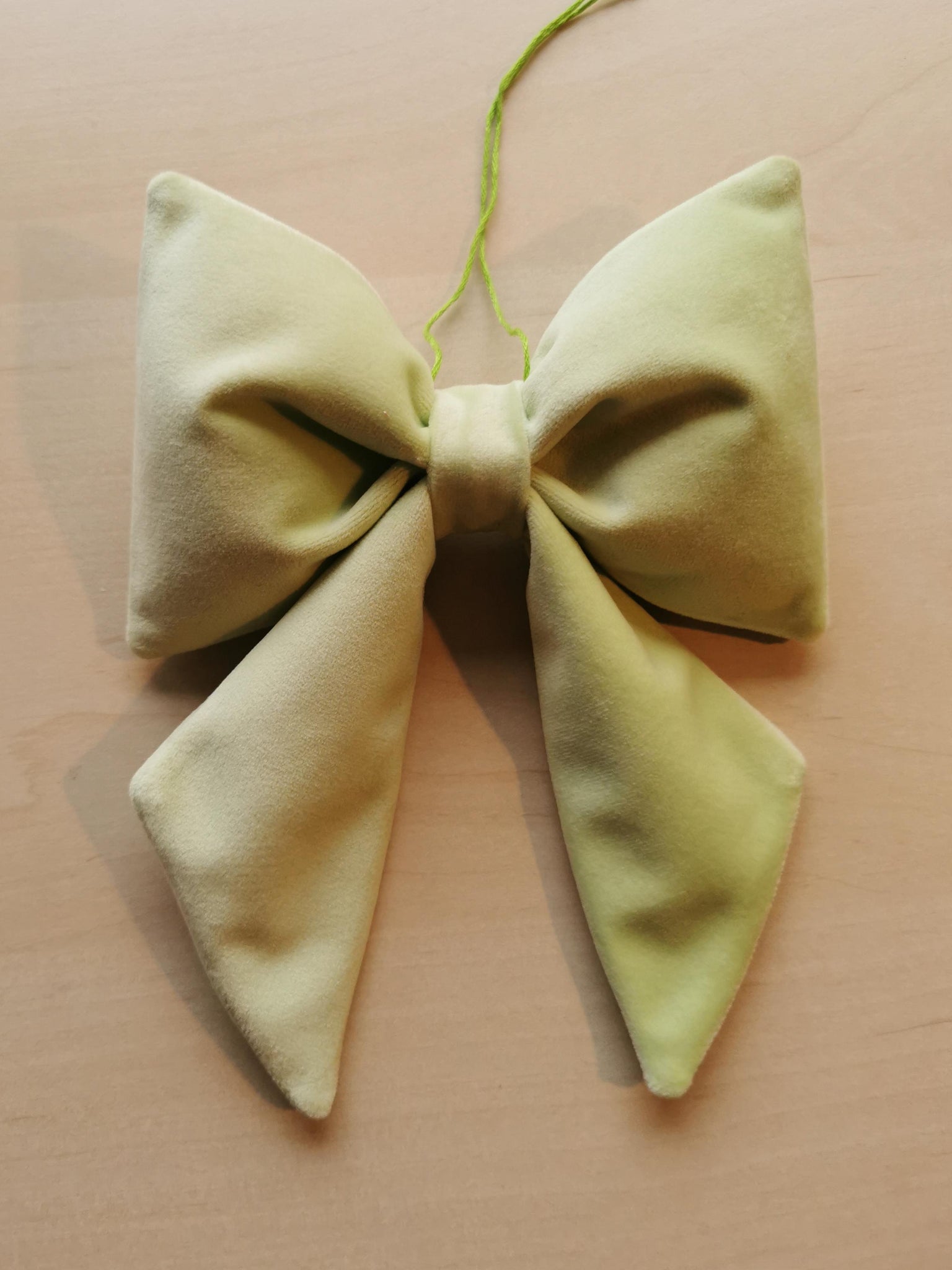 En fin sløjfe til ophæng syet af blødt, mintgrønt velour.