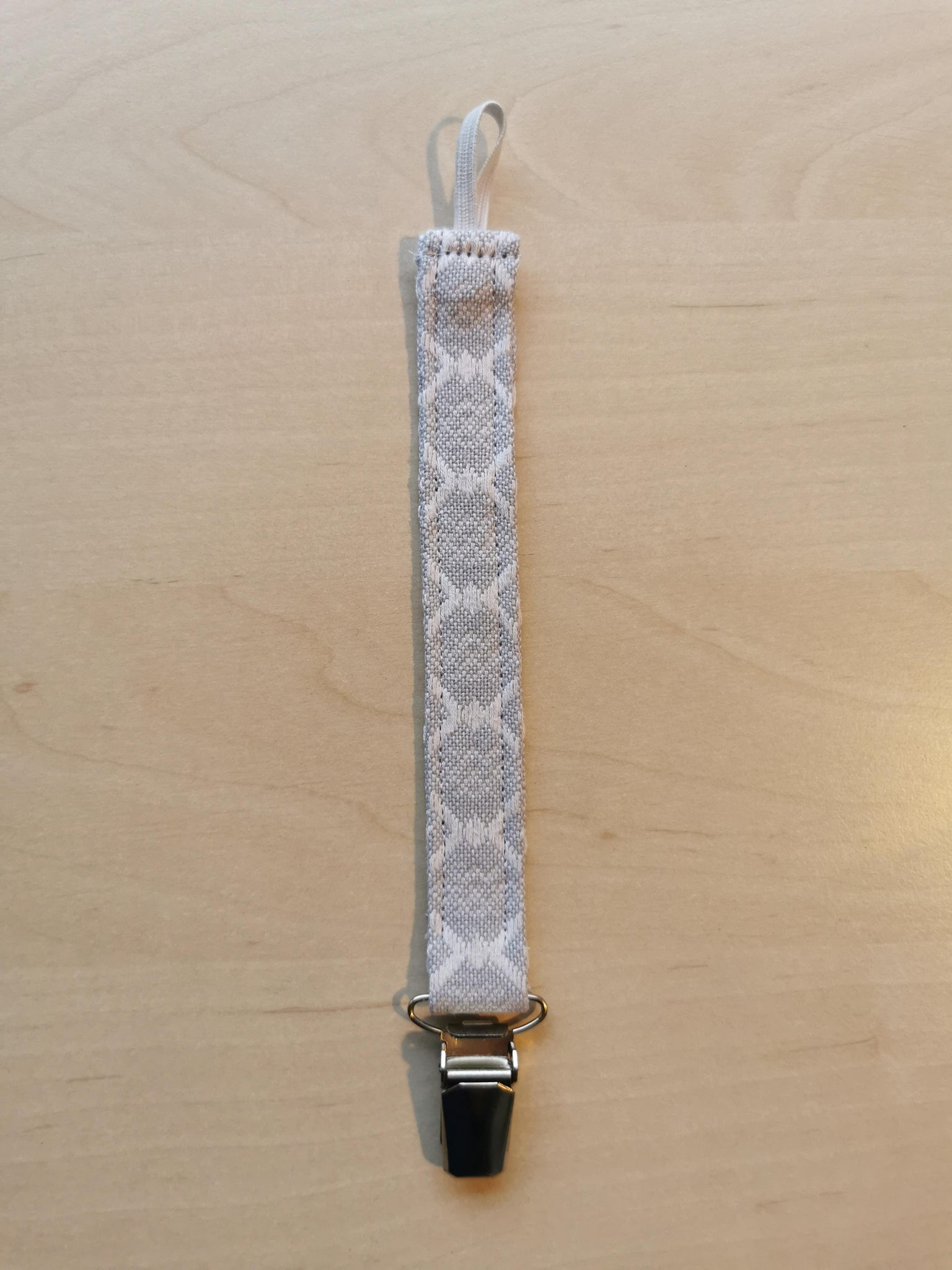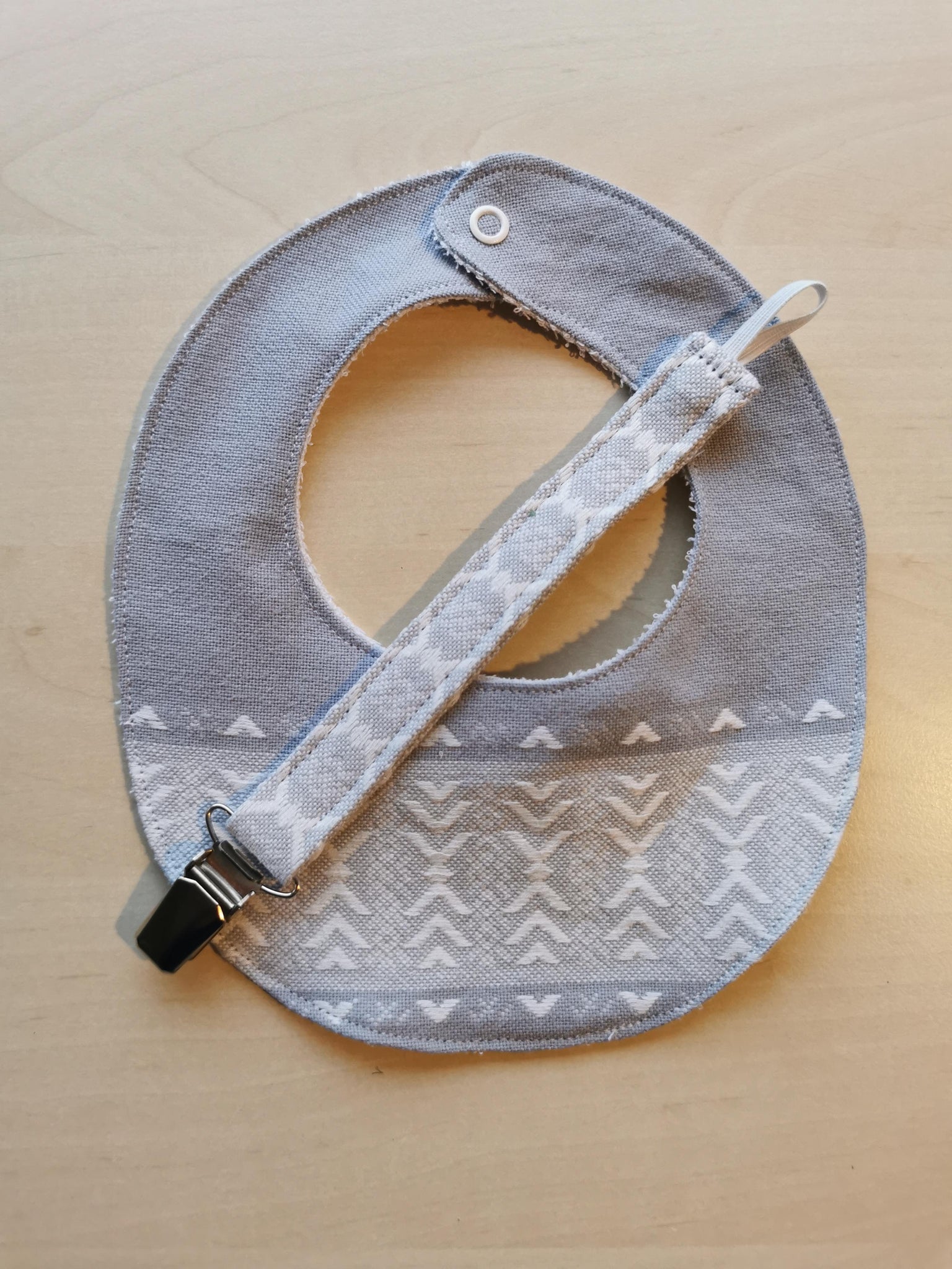 suttesnor syet af genbrugsstof i en fin støvet grå med hvide vævninger.